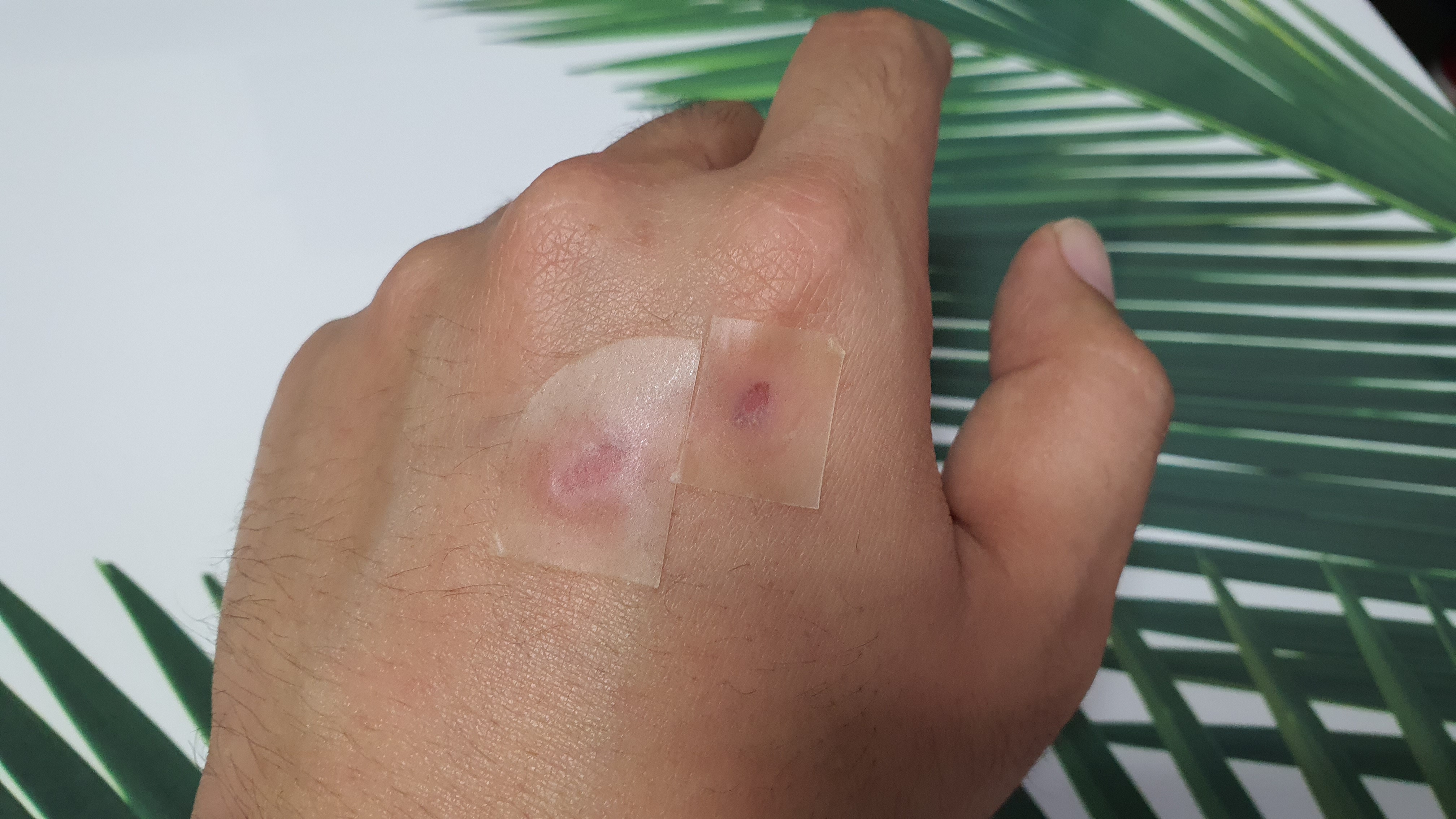 바로 물집을 제거 하고 집에 있는 빨간약(포비돈)으로 소독을 했다. 쓰라림이 상당했다. 소독약을 식염수로 헹구고 건조 후 메디폼을 잘라 바로 붙였다. 상처 초기라 그런지 메디폼 안쪽으로 진물이 빠르게 차올라 수시간만에 교체했다. 진물이 옆으로 새어 나오기도 했다. '조금 더 두껍고 진물 흡수율이 높은 메디폼을 살걸 그랬나?' 싶었지만 자주 움직이는 손 부위라 오히려 얇은 게 접착력이 좋았는지 움직여도 메디폼이 잘 떨어지지 않아 좋았다. 투명도도 높아서 티도 많이 나지 않는다는 게 메디폼 H의 장점이기도 했다.