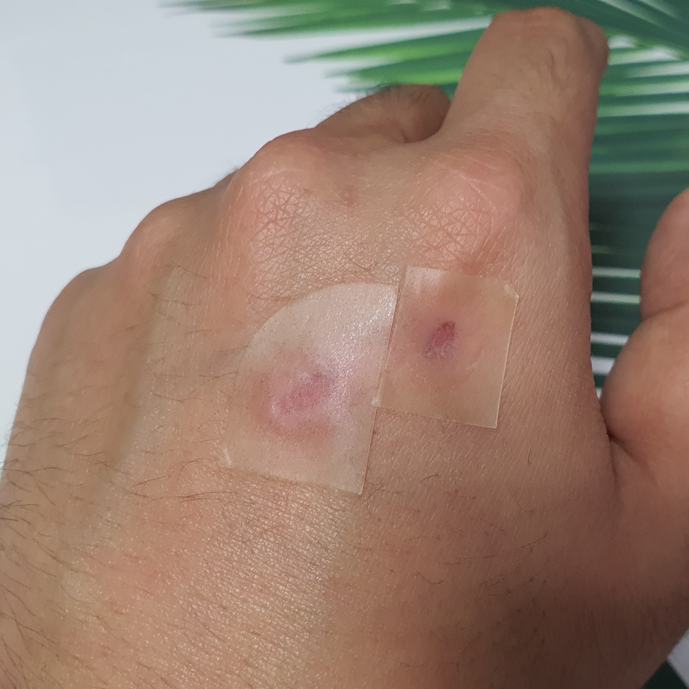 바로 물집을 제거 하고 집에 있는 빨간약(포비돈)으로 소독을 했다. 쓰라림이 상당했다. 소독약을 식염수로 헹구고 건조 후 메디폼을 잘라 바로 붙였다. 상처 초기라 그런지 메디폼 안쪽으로 진물이 빠르게 차올라 수시간만에 교체했다. 진물이 옆으로 새어 나오기도 했다. '조금 더 두껍고 진물 흡수율이 높은 메디폼을 살걸 그랬나?' 싶었지만 자주 움직이는 손 부위라 오히려 얇은 게 접착력이 좋았는지 움직여도 메디폼이 잘 떨어지지 않아 좋았다. 투명도도 높아서 티도 많이 나지 않는다는 게 메디폼 H의 장점이기도 했다.