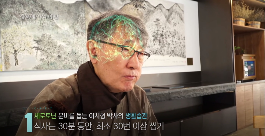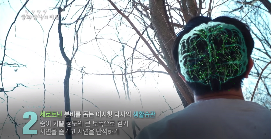 의학박사 이시형 교수는 건강한 생활습관으로 총 4가지를 실천하고 있는데 그는 힐링의 정체가 세로토닌이라는 행복 전달 물질이 많이 나오면 마음이 편안해지고 행복해진다고 주장하면서 세로토닌이라는 뇌에서 나오는 행복 호르몬은 씹는 저작운동을 하면 할수록 분비가 촉진되기 때문에 천천히 오래 씹는 행동 많으로도 행복을 느낄 수 있다고 한다 그밖에도 숨이 가쁠 정도로 큰 보폭으로 걷기 자연을 만끽하기 좋아하는 일에 집중하며 자기 긍정적인 마음 갖기, 뱃속까지 깊게 호흡하는 복식호흡 명상법을 통해 오감을 열고 온몸의 감각에 집중하기 등을 건강한 생활습관으로 제안했다.