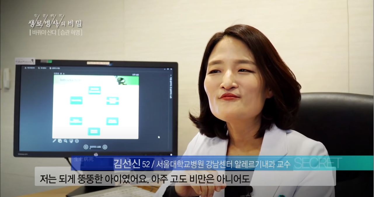 서울대학교 병원 강남센터 알레르기내과 김선신 교수의 건강한 생활습관은 나에게 맞는 방법을 선택하는 게 중요하다고 했다 한꺼번에 너무 많은 것을 바꾸려고 하면 오히려 단기간에 포기할 수 있으므로 생활 속에서 작고 사소한 것부터 하나씩 나에게 맞게 변화시키는 게 중요하다고 하는데 어렸을 때부터 비만이었던 김 교수의 생활습관은 식단과 계단 오르기 짬짬이 운동하기 등이었다. 그는 매일 점심을 도시락을 직접 마련해서 출근하는데 하버드 보건대학원에서 제안한 건강한 건강식으로 절반은 채소와 과일 나머지 4/1은 통곡물 나머지 4/1은 건강한 단백질로 구성된 식사를 하며 틈틈이 스트레칭과 운동으로 건강을 챙기고 있었다. 특히 인상 깊었던 것은 30층이 넘는 계단을 하루 한번 10분 안에 올라가는 습관이었는데 런지와 같은 근력 운동과 유산소 운동이 결합된 효과를 볼 수 있어 계단 오르기의 효과에 대해서도 설명했다.