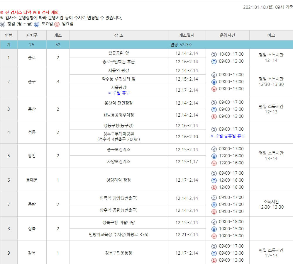 1월 18일(월) 09시 기준 서울 임시 선별 진료소 운영시간과 운영기간은 아래와 같다.