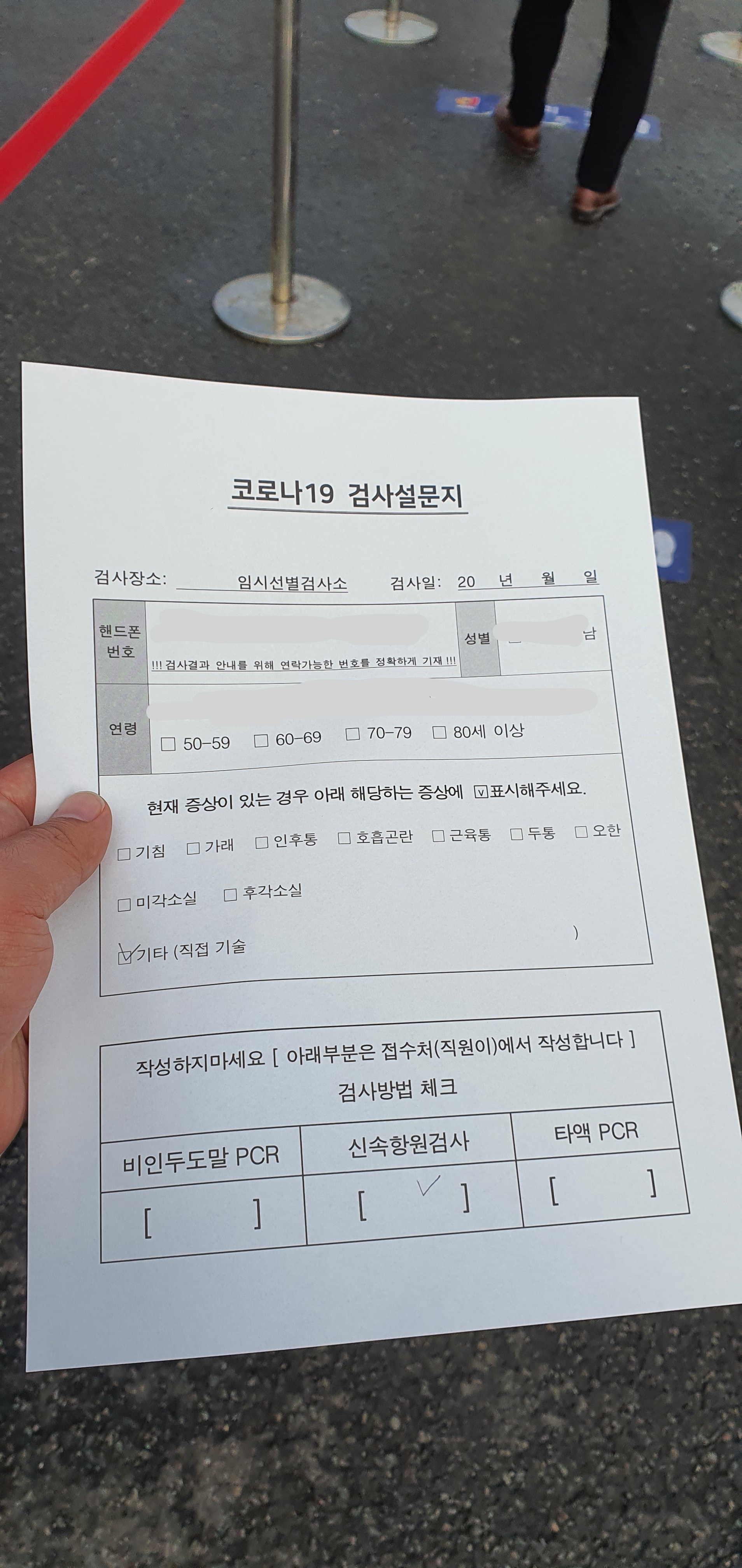 선별진료소에서는 기본적으로 익명으로 검사가 진행되기 때문에 검사 설문지에 휴대폰 번호를 작성하고, 연령대와 현재 증상을 체크한다. 선별검사소 검사비용은 검사방법에 관계없이 무료였다.