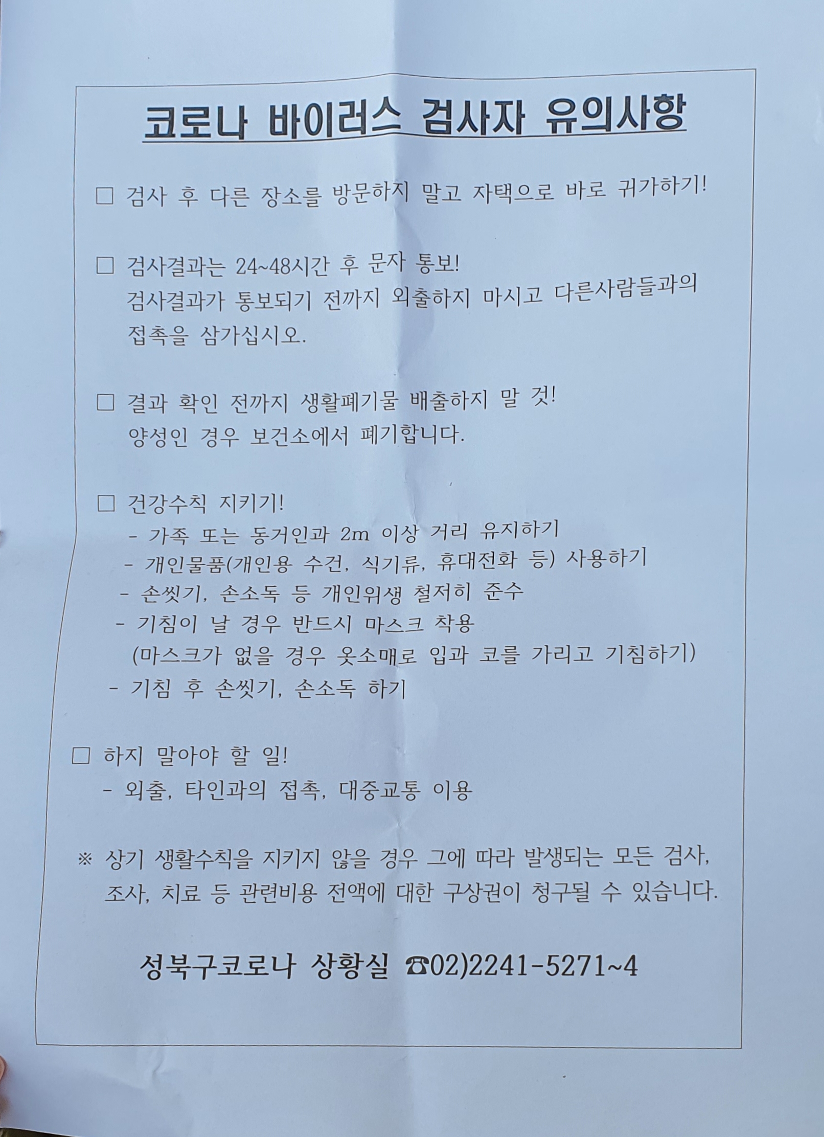 30분이 채 안돼서 검사원에게 결과가 나왔는지 물어보니 휴대폰 번호 뒷자리를 알려달라고 했다. 결과는 다행히 음성이었다.