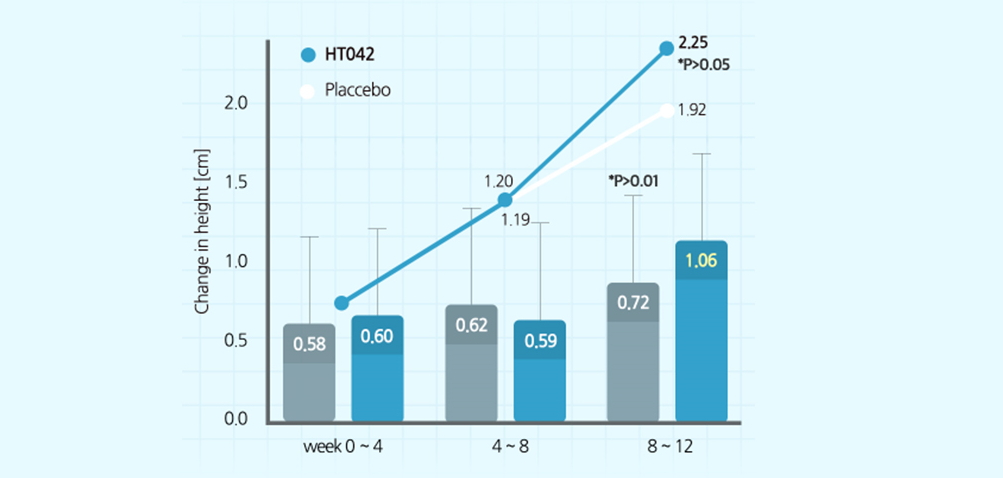 - HT042 - 식품의약품 안전처로부터 안정성과 기능성을 인증받은 성분으로 성장호르몬 분비 지표 증가 확인