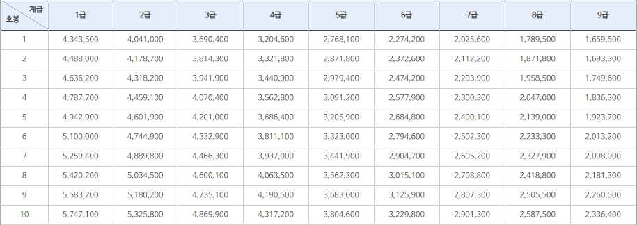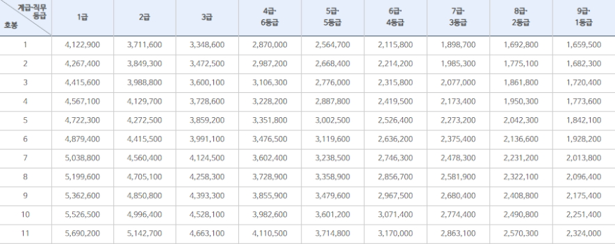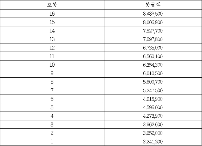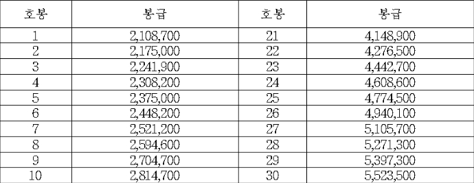 연구직 공무원 및 국가정보원 전문관 봉급표