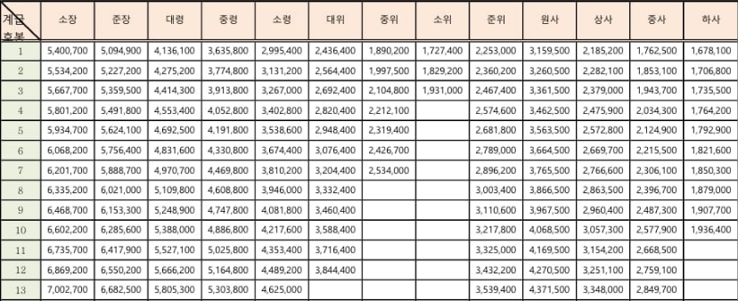 2021년 군인 봉급표입니다. 1호봉 기준 하사는 1,678,100 원 소장은 5,400,700 원 부터 시작합니다.