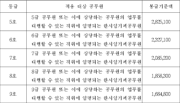 고정급적 연봉제 적용 대상 공무원의 연봉 표