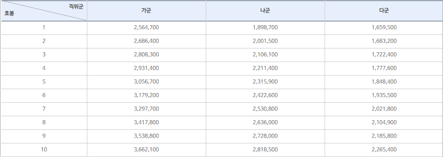 전문경력관은 가, 나, 다군으로 군별로 나뉘며 1호봉기준 다군은 1,659,500원 나군은 1,898,700원 가군은 2,564,700원부터 시작합니다.