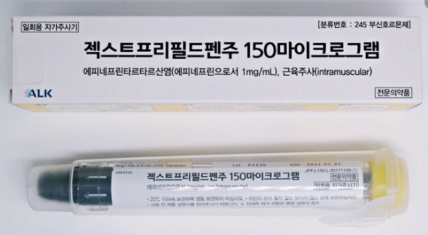 - 아나필락시스 증상이 심한 경우 에피네프린을 주사하는데 아드레날린 계열의 약이다. 이 에피네프린은 부신에 의해 만들어진 호르몬으로 보통 자동 주입기로 알려진 장치에 저장되는데 자동 주입기는 1회 복용 향의 약물을 채운 주사기를 운반하는 작은 장치이다. 아나필락시스 증상이 나타나기 시작하자마자 이 에피네프린 자동주사기를 허벅지에 대고 누르면 1회분 용량의 약이 투여된다.